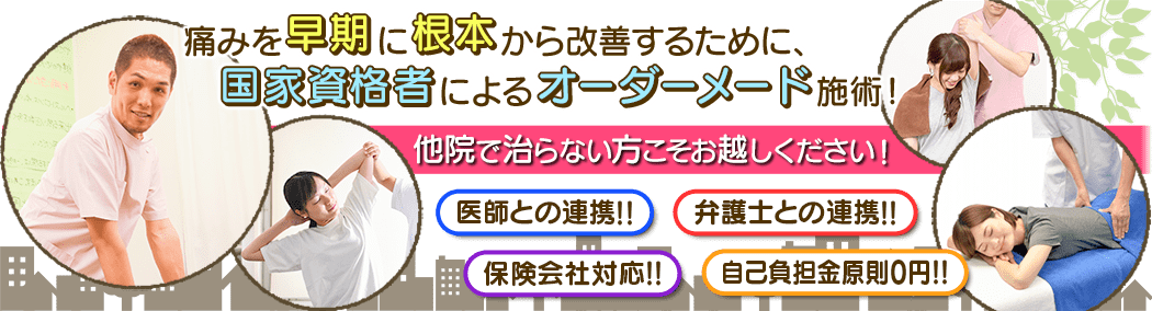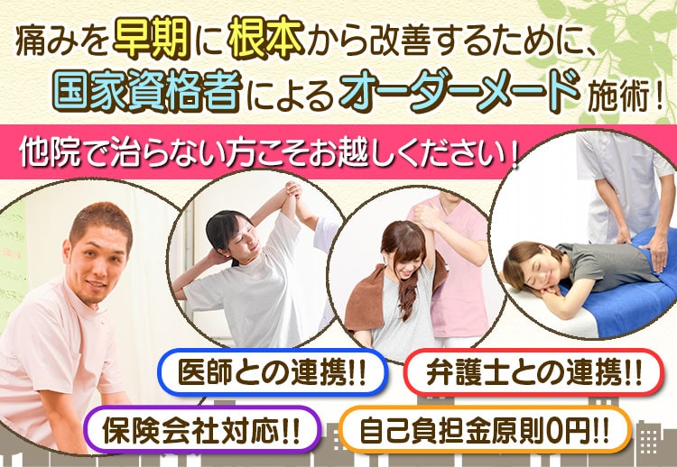 交通事故のケガの根本改善を目指すためには、痛みの原因を的確に突き止め、そこに効果的な施術を行うことが大切です。